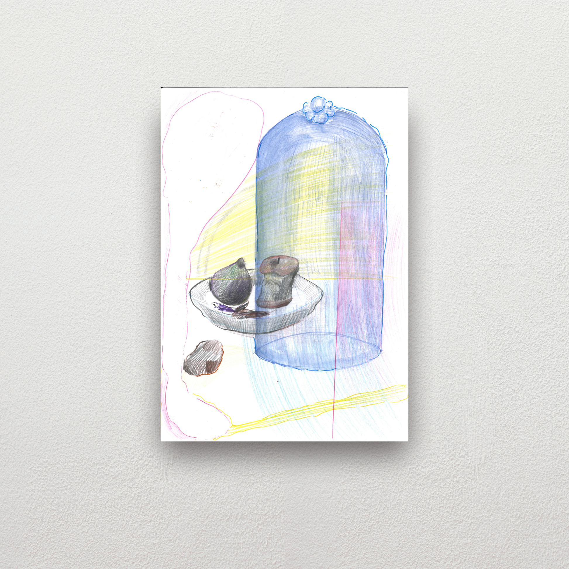 This composition turns a quiet still life into something gently surreal: a tall, bell-like blue form rises upwards like a glass dome, sheltering a plate with two fruit-like shapes, while a single stone or core rests just outside its orbit. Veils of yellow, pink, and violet move vertically through the form, and fine pencil lines hold everything together like a soft diagram of light and movement.
