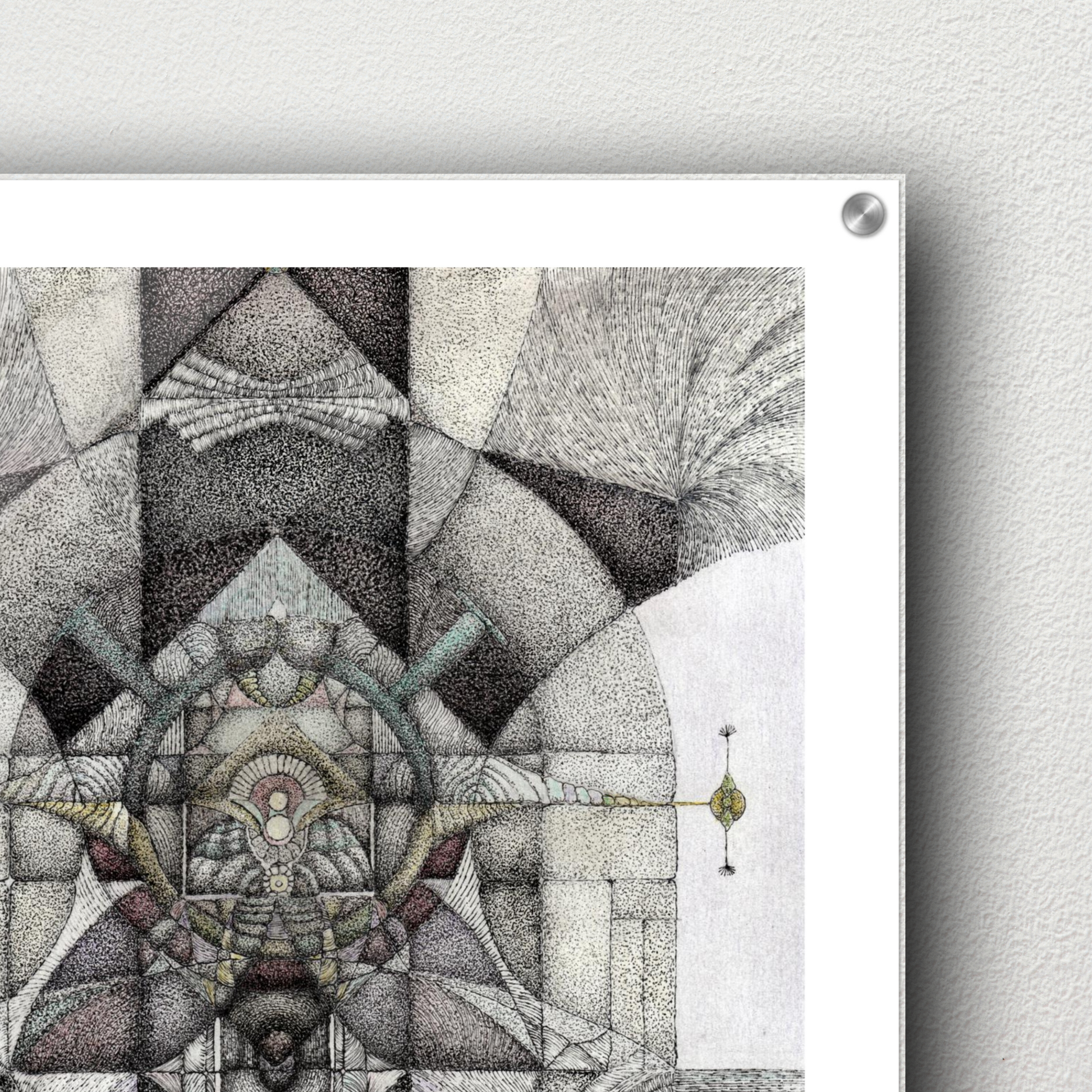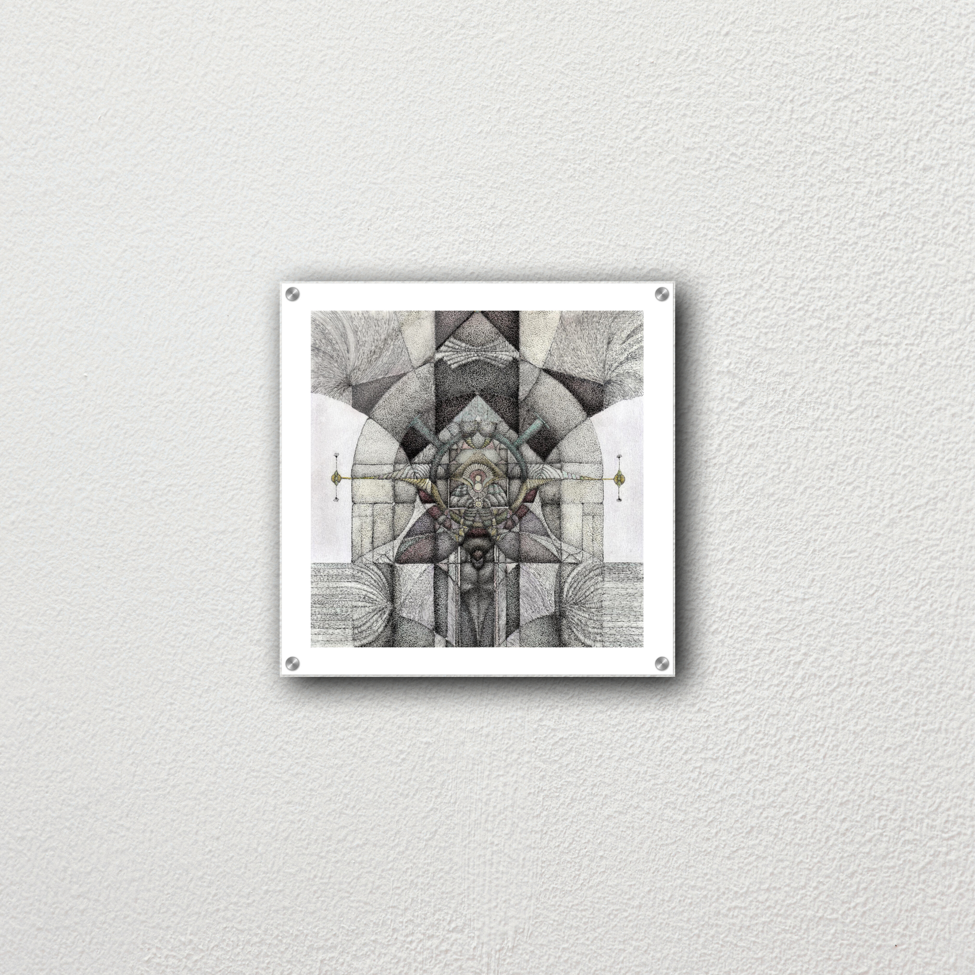 „G6“ entfaltet auf Acrylglas eine klare, leuchtende Tiefe: überlagerte Achsen, fein getupfte Texturen und architektonische Bögen erscheinen brillant und präzise; die ikonische Zentralfigur wirkt ruhig und konzentriert – zwischen Mythos und moderner Diagrammatik. Ein kontemplativer Blickfang für minimalistische wie expressive Interiors.