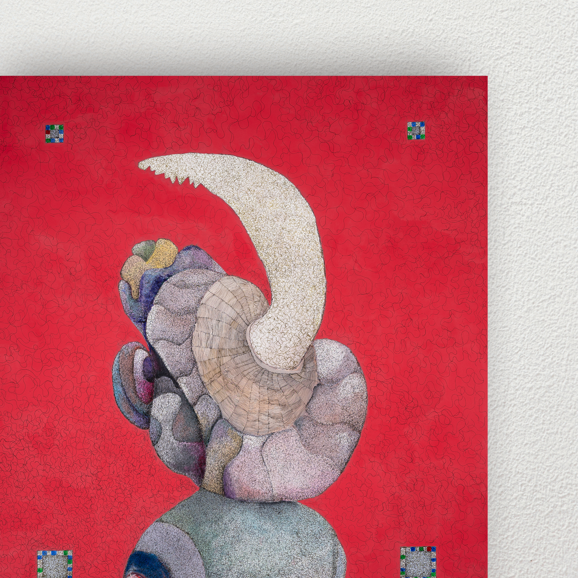 “GR7M” unfolds as a sculptural dialogue between form and depth. Layered organic structures rise through a vivid red field, where soft modeling meets architectural precision. The composition balances stillness and ascent—monumental yet meditative—embodying strength, clarity, and quiet motion.
