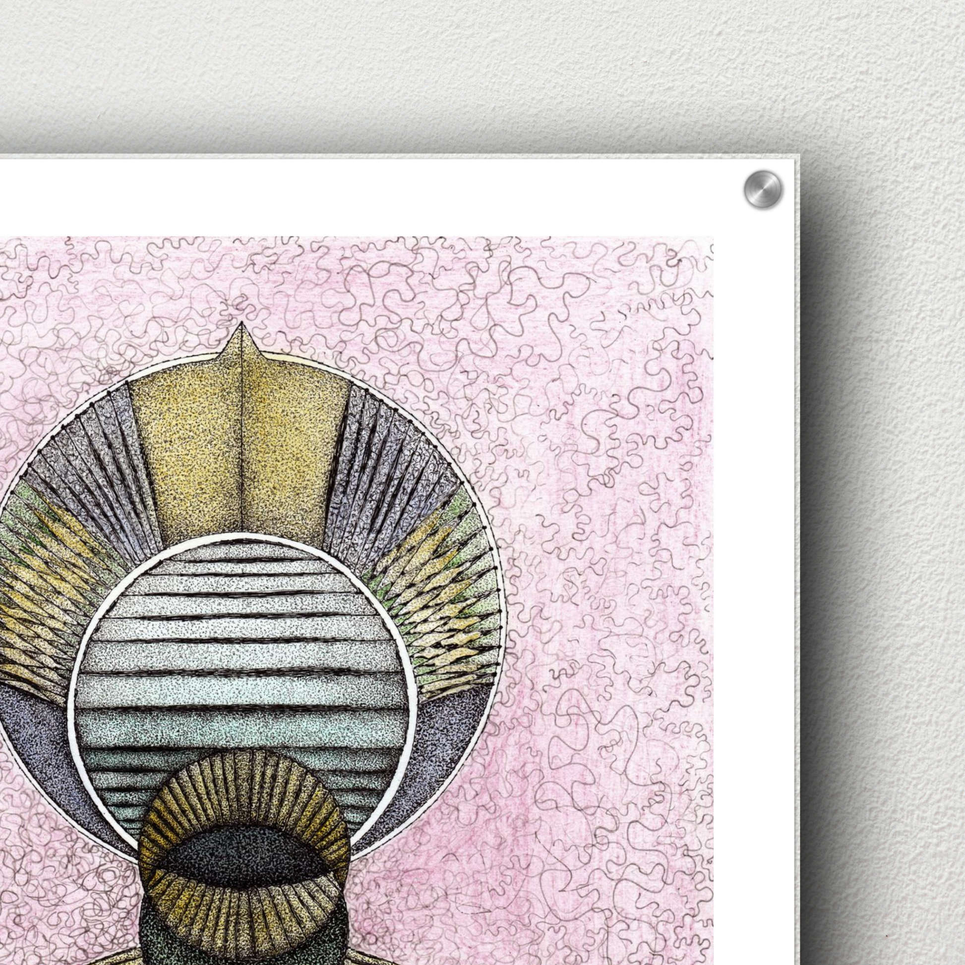 „Kn“ entfaltet auf Acrylglas eine klare, leuchtende Tiefe: konzentrische Formen und fein getupfte Texturen erscheinen brillant und präzise, während die ikonische Figur ruhig und fokussiert wirkt – zwischen Mythos und moderner Diagrammatik. Ein kontemplatives Statement-Piece für minimalistische wie auch expressive Interiors.